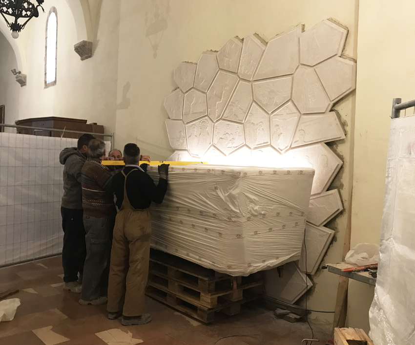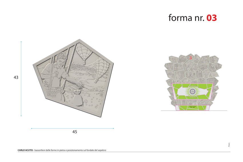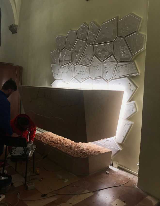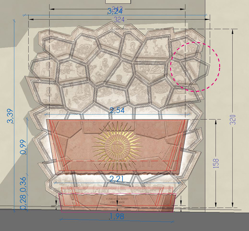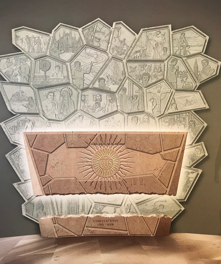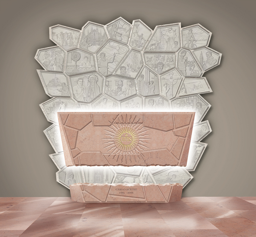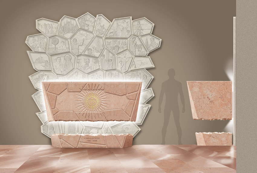 Para comprender e inspirarse en Carlo, numerosas piezas de un gran mosaico forman el telón de fondo, moviéndose erráticamente, narrando momentos de la vida, amigos y pasiones del joven Carlo, dando testimonio de su gran fe. Están representadas en bajorrelieves sobre piedra pálida y parecen cobrar vida gracias a una luz colocada en la parte posterior del sarcófago... una luz que amplifica aún más este momento donde el misticismo y la gracia se fusionan.