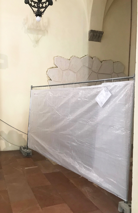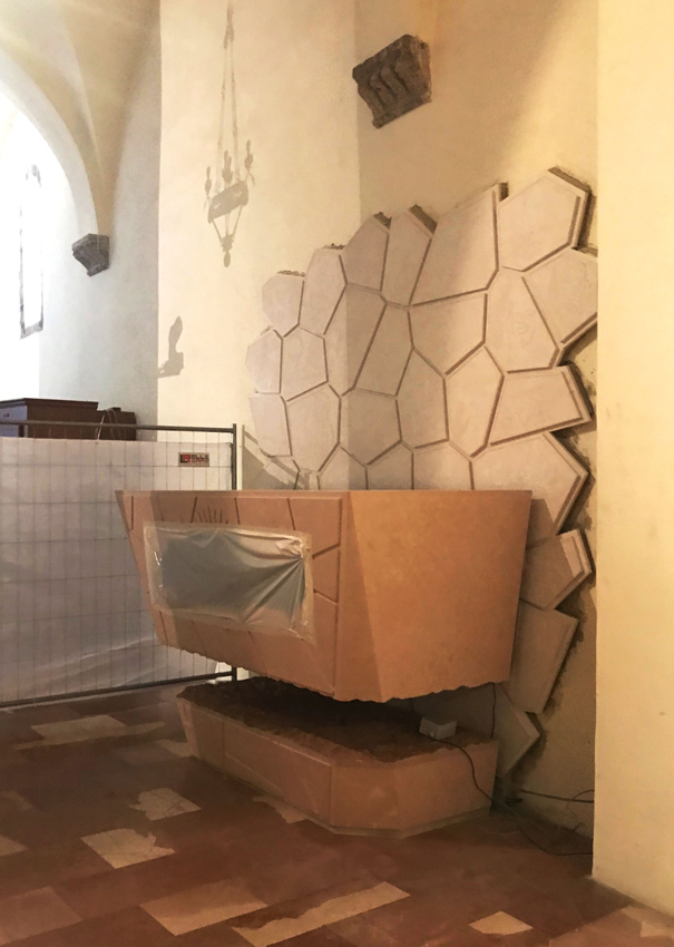La elección de un material como la Piedra Rosa es casi natural y significativa en Asís, considerando que muchos componentes de la iglesia que alberga los restos de Carlo (ver el suelo) son del mismo tipo y color.