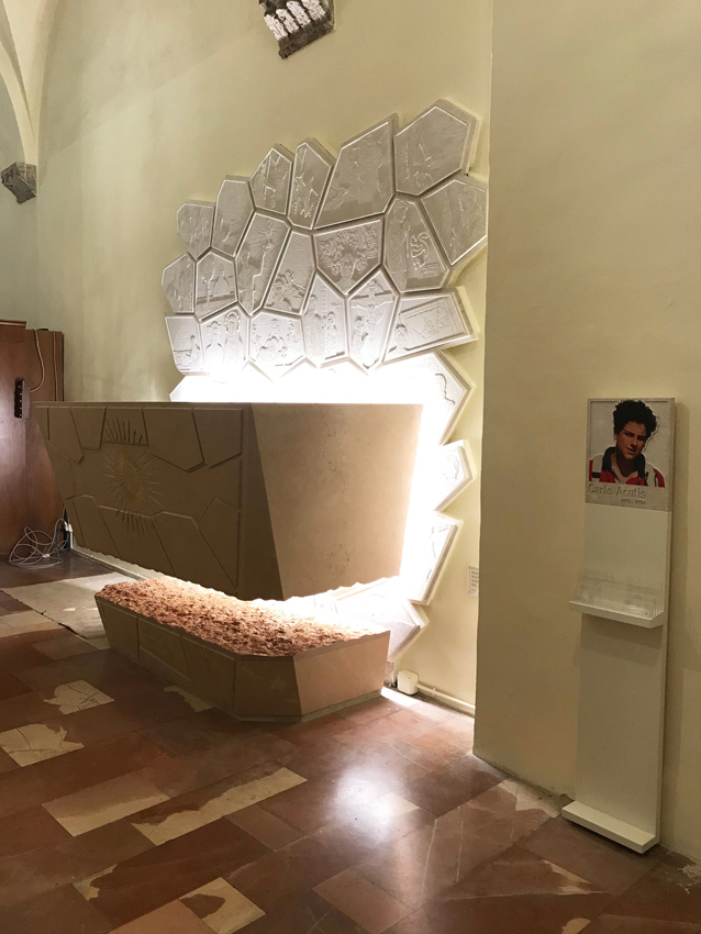 Para sellar este lugar sagrado como un sello, encontramos el símbolo de la Eucaristía grabado en el sarcófago, un tema muy querido por Carlo que consideraba "su camino hacia el Cielo".